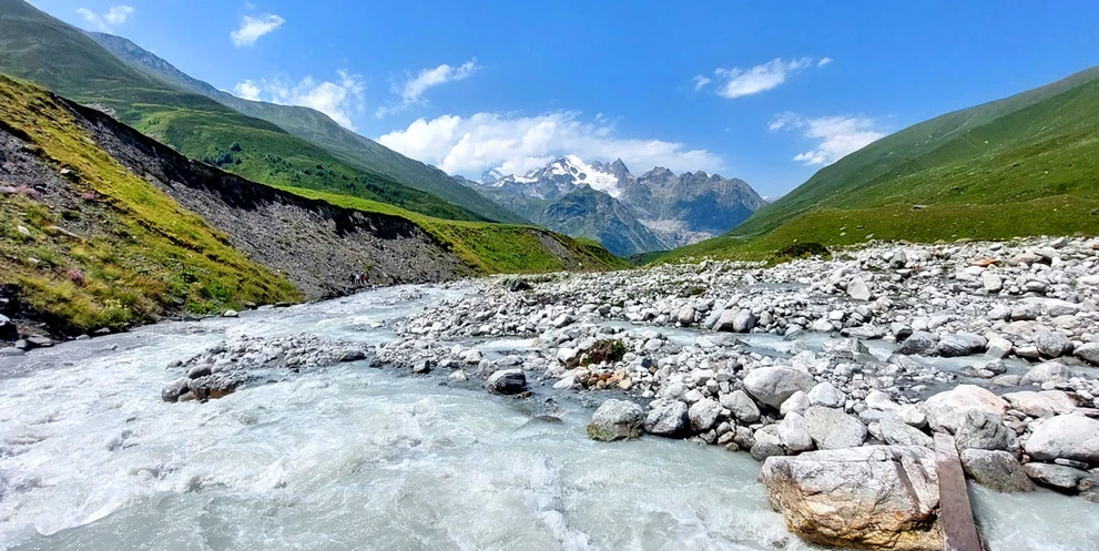 На машине повышенной проходимости сегодня едем поближе к Главному Кавказскому хребту, чтобы полюбоваться на снежные вершины и совершить треккинг к леднику Уштулу.