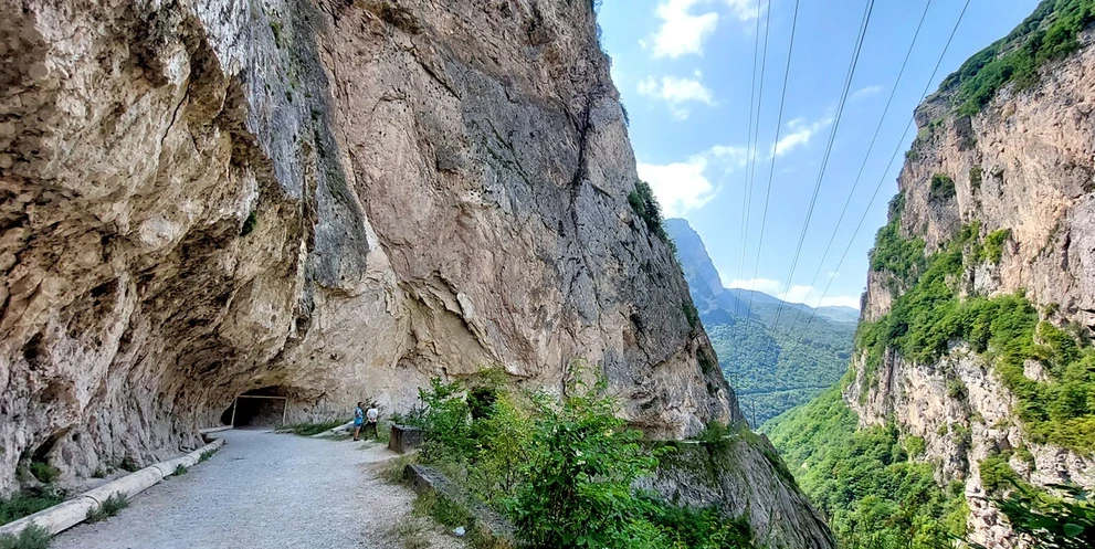 По пути сделаем остановку в очень эффектном месте – на Черекской теснине! Автомобили здесь проезжают по горному туннелю, а мы прогуляемся по старой дороге, которая ведет вдоль глубокого горного ущелья. Здесь же можно будет приобрести вкусные и полезные кавказские сувенирчики ;).