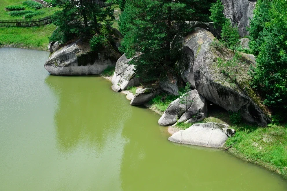 - Сказочный ландшафт. В центре композиции — знаменитая скала «Голова Кита», чьи очертания словно выточены природой в форме морского гиганта. Вокруг — массивные каменные глыбы, поросшие деревьями, и зеркальная гладь озера, меняющая цвет от нежно‑голубого до изумрудного.