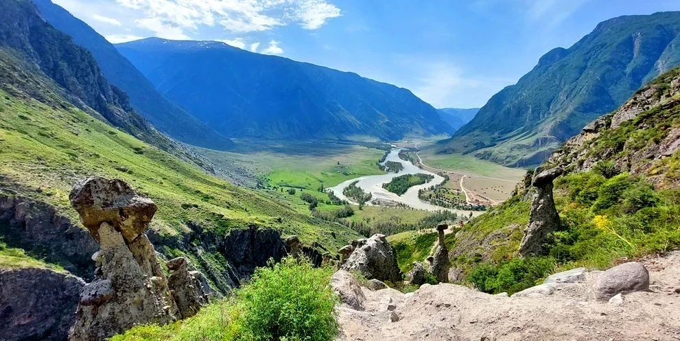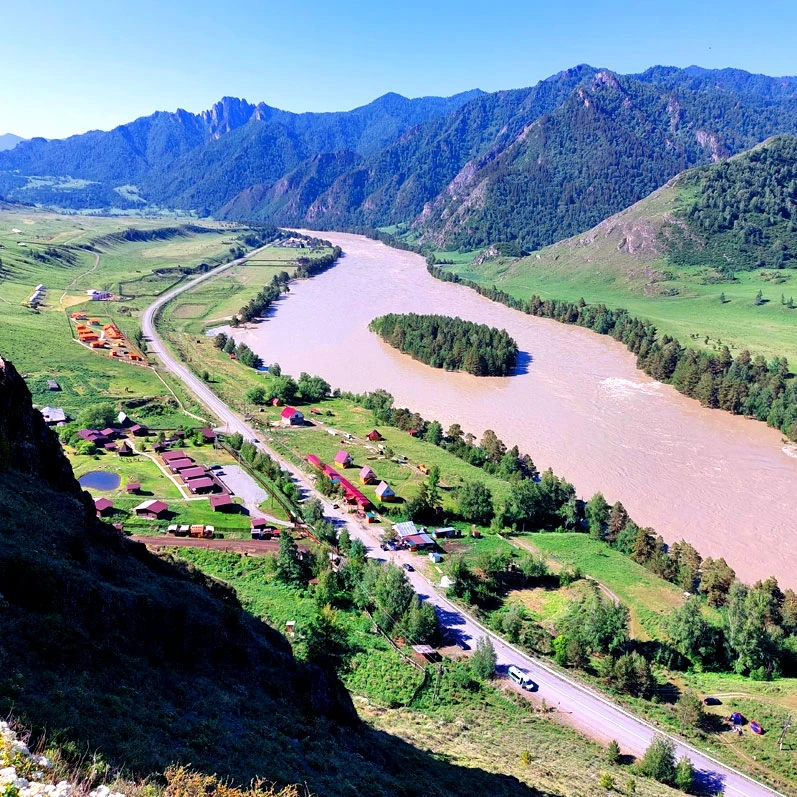 • сходим в ущелье Горных духов. Нас ждет треккинг по горным тропам Алтая, посмотрим живописные скалы и со смотровой площадки увидим Сердце Катуни – небольшой остров посередине реки.