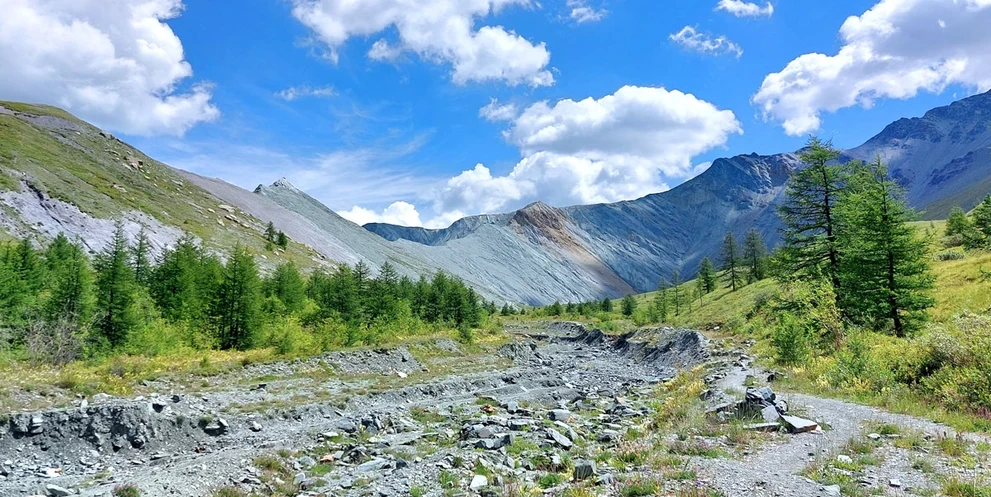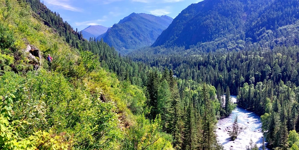 Собрав лагерь, двигаемся налегке вдоль реки Аккем, по склону хребта, поросшего кедром и лиственницей. Справа порой будут обрывы и покажется горная река Аккем. По пути иногда будем переходить по камешкам небольшие ручейки.