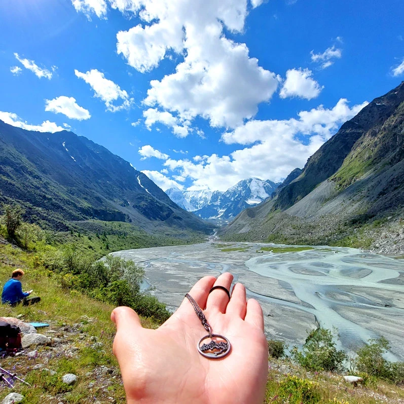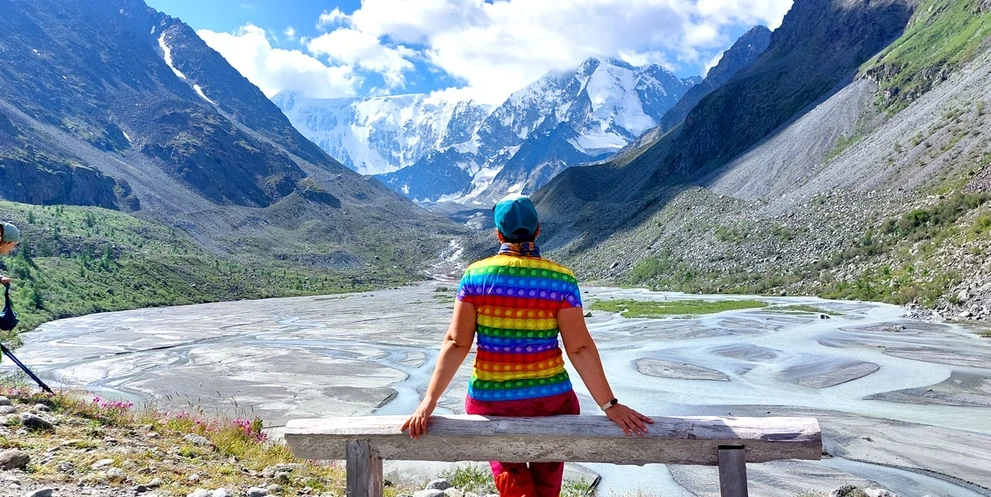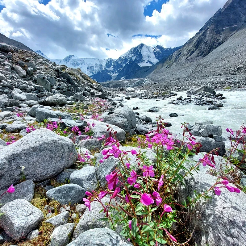 Идем дальше, фотографируем ледник и с каждым шагом приближаемся к Белухе. Инструктор позволит нам подойти на безопасное расстояние к леднику. Здесь сделаем небольшой привал, а затем отправимся вниз по долине.