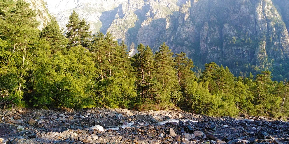 Пройдя большую часть пути, выйдем к беседке. Здесь лес расступается – и прямо перед нами открываются высокие горы, а вдалеке блестит ледник Цей. Идем поближе к леднику! Вблизи он смотрится живым, огромным. Ледник словно дышит, постоянно шумит и живет своей жизнью. Из-под ледника вытекает очень бурный поток воды.