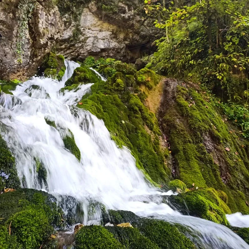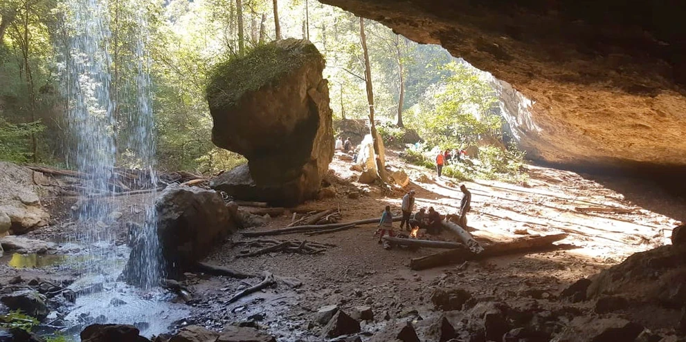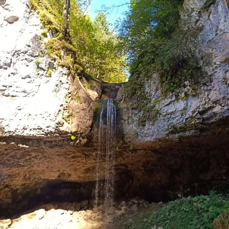 Далее тропа уведет нас за собой по сказочному самшитовому лесу к пещере Исиченко. Из пещеры вырывается мощный водопад! Вода здесь питьевая, очень чистая. От пещеры даже проложен водопровод, по трубам которого вода поступает в поселок Мезмай.